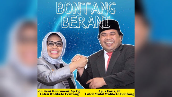Foto berbentuk poster tersebut, menunjukan Neni berpose salam komando bersama Agus Haris, lengkap dengan tulisan “Bontang Berani”.