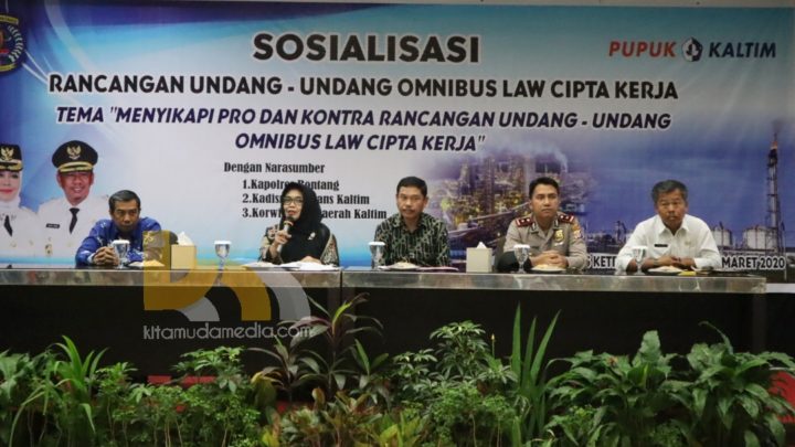KLAUSANEWS,Bontang – Beberapa waktu terakhir omnibus law memicu perdebatan tingkat nasional, untuk menyikapi pro dan kontra Rancangan Undang – Undang omnibus law cipta kerja tersebut, Dinas Ketenagakerjaan (Disnaker) Kota Bontang menggelar sosialisasi dengan menghadirkan, narasumber perwakilan Kapolres Bontang, Kadisnakertrans Kaltim, Korwil I BIN Daerah Kaltim dan audience perwakilan perusahaan, Serikat Pekerja dan pihak terkait lainnya. Acara berlangsung di Hotel Equator pada Kamis (5/3/2020).