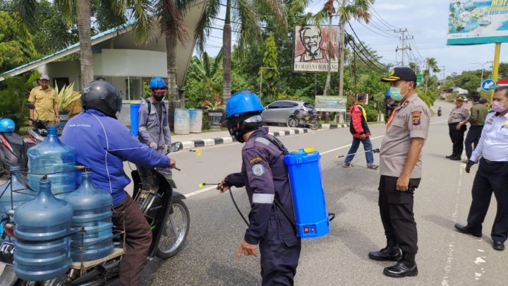 Selain melakukan penyemprotan terhadap kendaraan yang berasal dari luar daerah, petugas juga melakukan cek suhu tubuh penumpang.