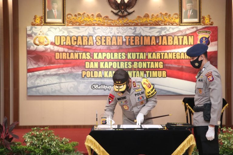 Serah terima jabatan berlangsung di Gedung Mahakam Polda Kaltim, Kamis (13/8/2020) dengan mengutamakan protokol kesehatan. AKBP Boyke Karel Wattimena, kini bertugas sebagai Wadir Polair Polda Kaltim, sedangkan penggantinya AKBP Hanifa Martunas Siringoringo sebelumnya menjabat sebagai Kasubdit Subdit 1 Ditreskrimum Polda Kalbar.