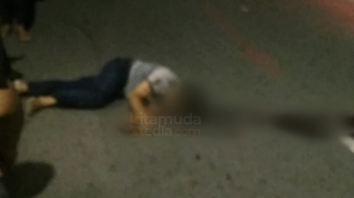 Setibanya di dekat tugu adipura, entah apa sebabnya, tiba-tiba kendaraan roda dua itu menabrak pohon yang ada di tengah jalan. Seketika itu si pengendara yang mengenakan kaos abu-abu terkapar di tempat. Sedangkan rekannya yang di bonceng terlempar ke jalan sebelahnya.