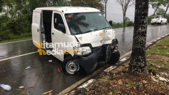 Mobil bernomor kendaraan KT 8768 NP tersebut terlihat ringsek dibagian depan setelah menabrak pohon dan trotoar pembatas jalan.