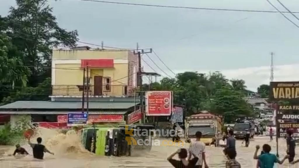 KLAUSANEWS, Bontang – Truk pengangkut batu bara terguling di kilometer 5 jalan poros Bontang-Samarinda saat berusaha menerobos genangan banjir setinggi pinggang orang dewasa dan mengakibatkan lalu lintas macet.