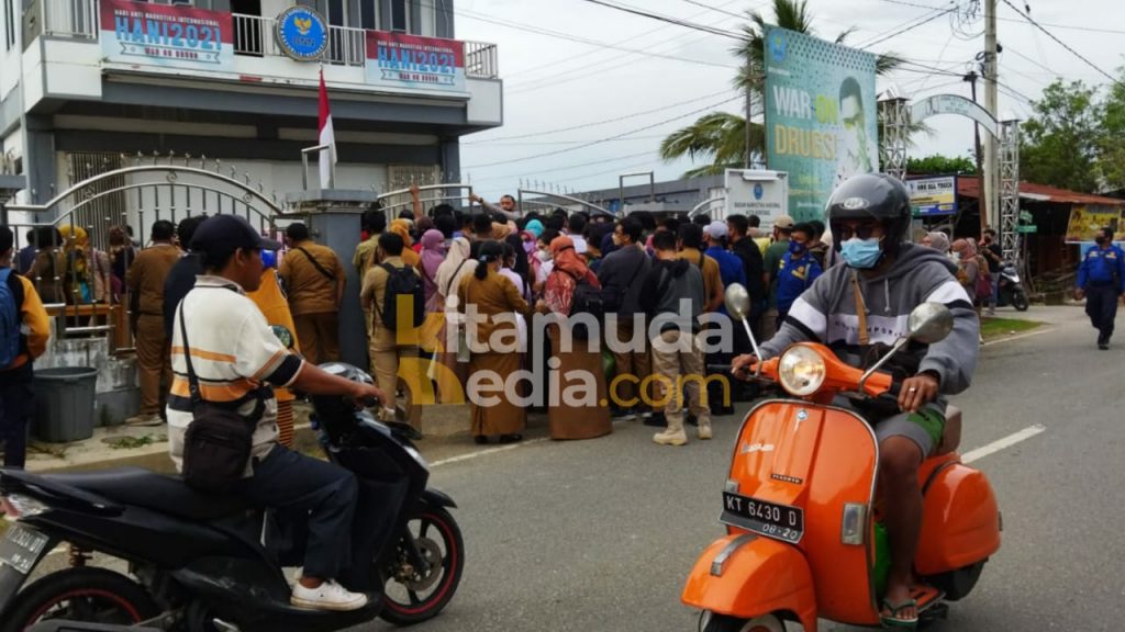 KLAUSANEWS, Bontang – Ratusan orang tenaga kontrak daerah atau TKD pemerintah Kota Bontang berjubel di depan pintu gerbang kantor Badan Nasional Narkotika Kota (BNNK) Bontang, di Jalan Pattimura, Kelurahan Api-Api, Bontang Utara, Senin (3/1/2021).