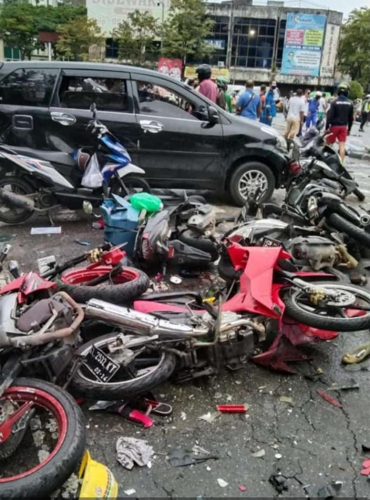Akibat kejadian tragis itu, puluhan kendaraan pribadi rusak parah dan terlihat ada korban meninggal dan luka-luka tergeletak di jalan dan sejumlah relawan, dan petugas sibuk membantu dan mengevakuasi korban.