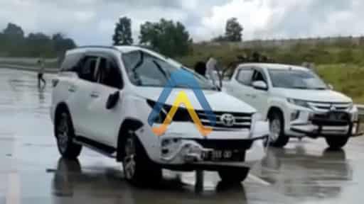 Dari video yang beredar terlihat mobil rusak parah di bagian depan. Kondisi jalan terlihat basah akibat guyuran hujan.