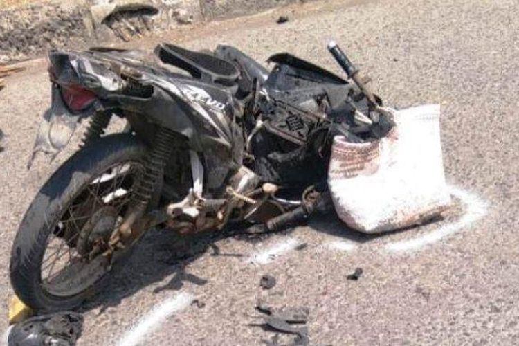 Selain motornya yang ringsek, pasangan tersebut juga meninggalkan satu keranjang belanja yang berisi ratusan sate usus dan keong.