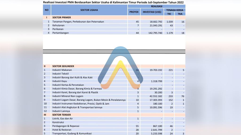 KLAUSANEWS, Bontang– Realisasi PMA berdasarkan sektor usaha, subsektor Pertambangan mendapatkan tambahan investasi terbesar yaitu US$ 142,79 Juta (Rp 2,08 Triliun) atau sebesar 46,46% dari keseluruhan realisasi PMA Triwulan III tahun 2022.